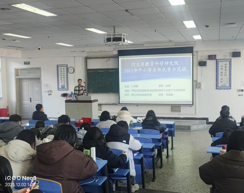 2025年12月2日,唐山师范学院资源管理系邀请河北省初中地理教研员张海涛老师于文11阶开展了一场主题为“中国交通运输的快速发展及其对人们生产生活的影响”的名师示范课教学经验分享活动。张老师结合省级一等奖优质示范课例,深入解读新课标下初中地理教学的创新路径与实践方法,为广大师生师提供了宝贵的教学参考。