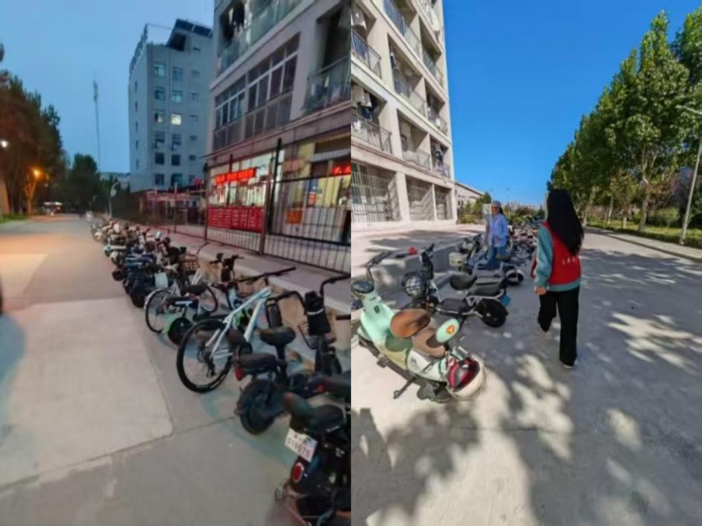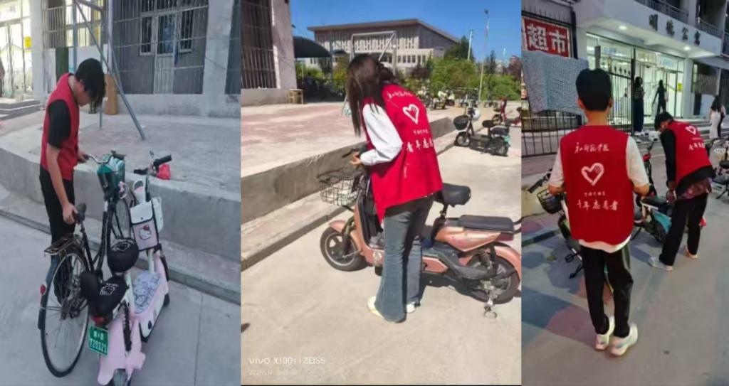 活动启动期间,10余名志愿者接受了岗前培训,明确了“分区引导、规范停放、文明劝导” 的服务准则。在北院教学楼前的停放区,志愿者们一边协助将错位的电动车挪至划线区域内,一边提醒大家注意 “车头同向、不占道”;针对部分因电池重量大而难以摆正的车辆,志愿者主动上前搭把手,默契配合完成规范停放。