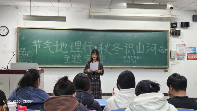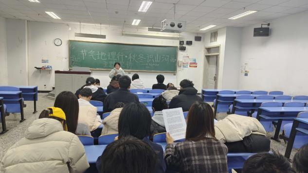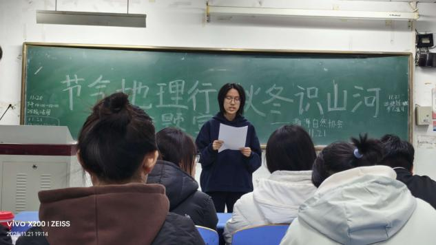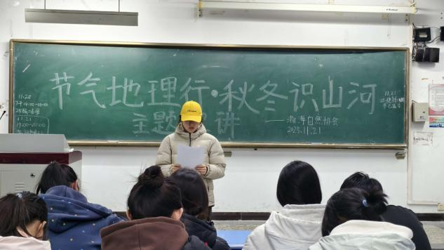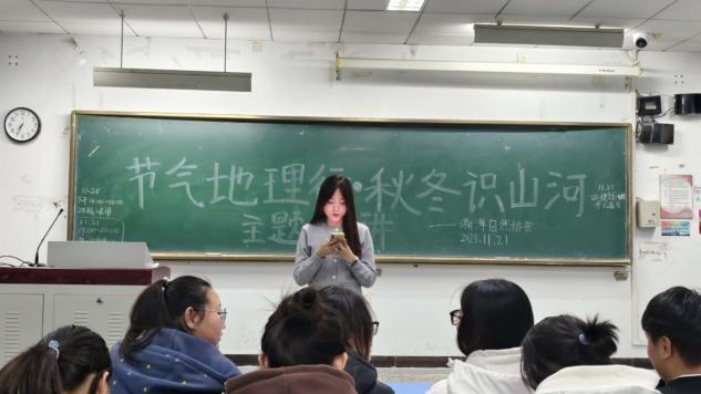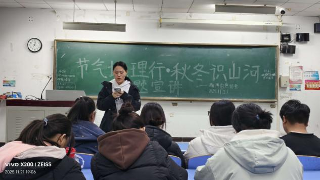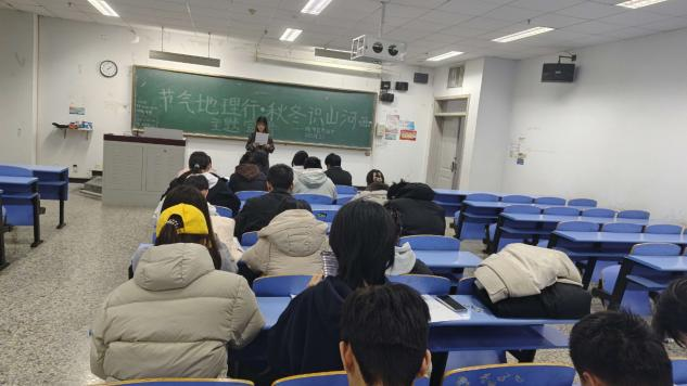 为深化节气文化与地理知识的融合,引导学生感知秋冬自然脉络,瀚海自然协会于11月21日在北苑文410教室开展“节气行地理·秋冬识山河”宣讲活动。活动以“解码节气智慧,探寻秋冬地理奥秘”为核心,通过理论宣讲、互动体验与实践创作,为师生打造了一场兼具科普性与趣味性的自然文化盛宴。