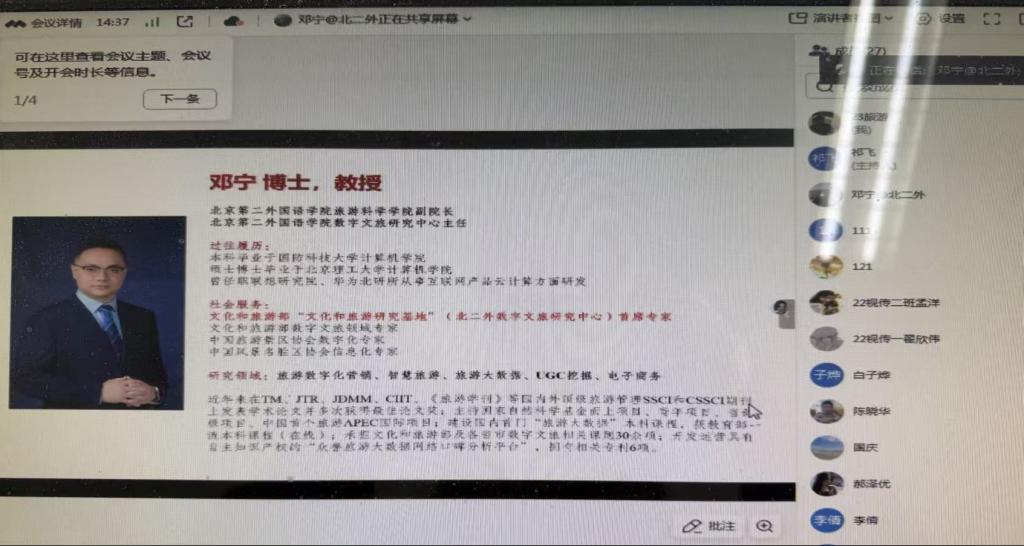 在数字中国战略深入推进、文旅行业加速数字化转型的时代背景下,10月31日,资源管理系旅游管理专业紧扣行业发展脉搏,成功举办数字文旅专题线上讲座。本次活动特邀北京第二外国语学院旅游科学学院副院长、数字文旅研究中心主任邓宁教授主讲,以“数字文旅:理论逻辑与现实问题”为核心主题,通过腾讯会议平台搭建学习桥梁,专业200余名师生采用线上线下融合模式参与研讨,为应用型文旅人才培养注入前沿动能。