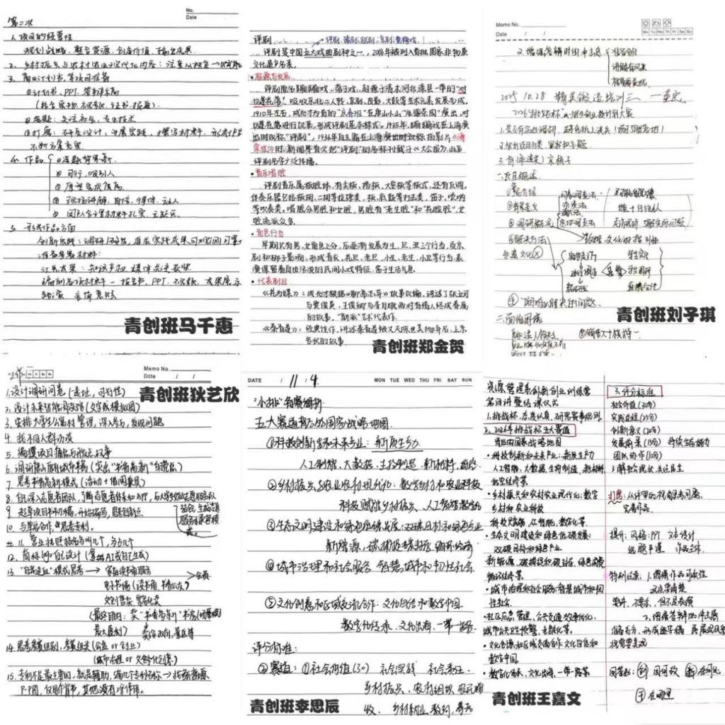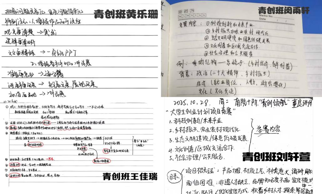 每组推2人参与,优秀笔记每人次加3分,报名不足扣2分——积分的“正向引导”,让“记笔记”从“任务”变成“展示思考深度的赛场”,各组主动梳理讨论疑点、标注导师建议,在“争积分”中沉淀了创新创业的思维方法。