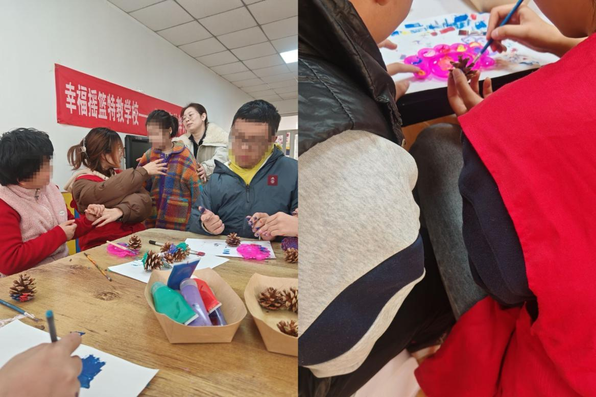 活动伊始,幼儿园老师为志愿者们介绍了孩子们的基本情况。在园方精心准备的松果、环保颜料和画笔等材料辅助下,志愿者们与心青年们一一结对,开启了创作之旅。从认识颜色、选择画笔,到勾勒涂抹、发挥想象,志愿者们始终耐心引导、鼓励互动。一颗颗朴素的松果,在共同努力下,逐渐被点缀上缤纷的色彩,焕发出独特的光彩与生机。活动现场气氛融洽,心青年们神情专注,时而与志愿者轻声交流,时而展示自己的创作成果,笑容与色彩相互映衬,温暖洋溢。