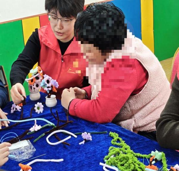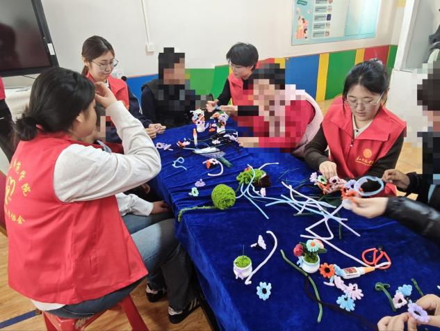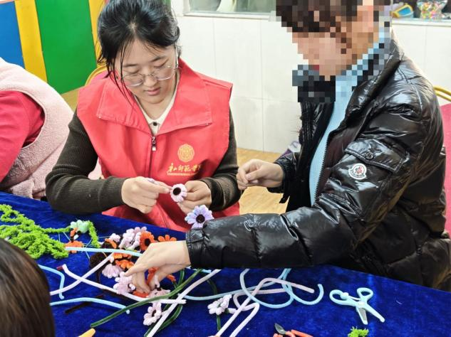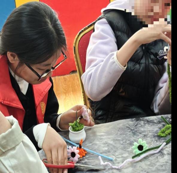 伴随着轻松愉悦的氛围,手工制作环节正式开始。志愿者们一对一、手把手,俯身耐心指导。从扭扭棒的弯折、塑形、缠绕,到花色的创意搭配,再到花朵盆栽的组装固定,每一个步骤都细致讲解、反复示范。对于孩子们的疑问与尝试,志愿者们放慢节奏,轻声鼓励,引导孩子们大胆想象、自由搭配色彩,在动手中感受创造的乐趣。
