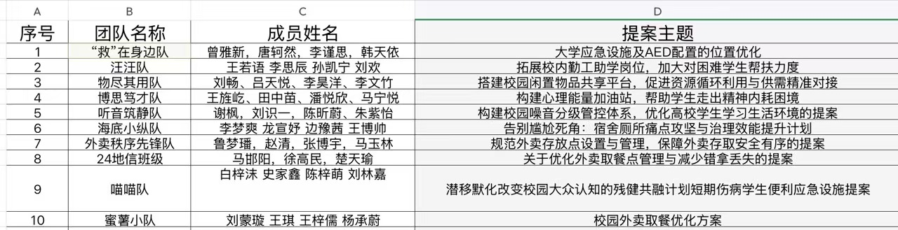 大赛现场,十组参赛选手依次登台亮相,依次进行提案展示。各队伍以扎实的实地调研为基础,结合日常校园生活观察,围绕不同方向提出切实可行的解决方案。展示过程中,选手们逻辑清晰、表达流畅,将专业思维与校园实际紧密结合,每一份提案都兼具针对性与可落地性,充分展现了资源管理系学子心系校园、善于思考、勇于担当的精神风貌,赢得现场评委与观众的阵阵掌声。