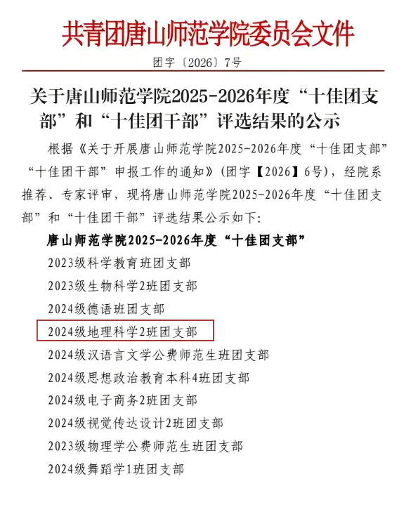 近日,共青团唐山师范学院委员会公布了2025-2026年度校级“十佳团支部”评选结果,资源管理系24级地理科学2班团支部成功入选。本次评选经过系部推荐、材料初审、现场答辩、网络公示四个环节,24级地理科学2班团支部从全校15个参评候选支部中脱颖而出,凭借扎实的思想建设、丰富的实践活动和亮眼的学业成绩,获得了评委们的一致认可。