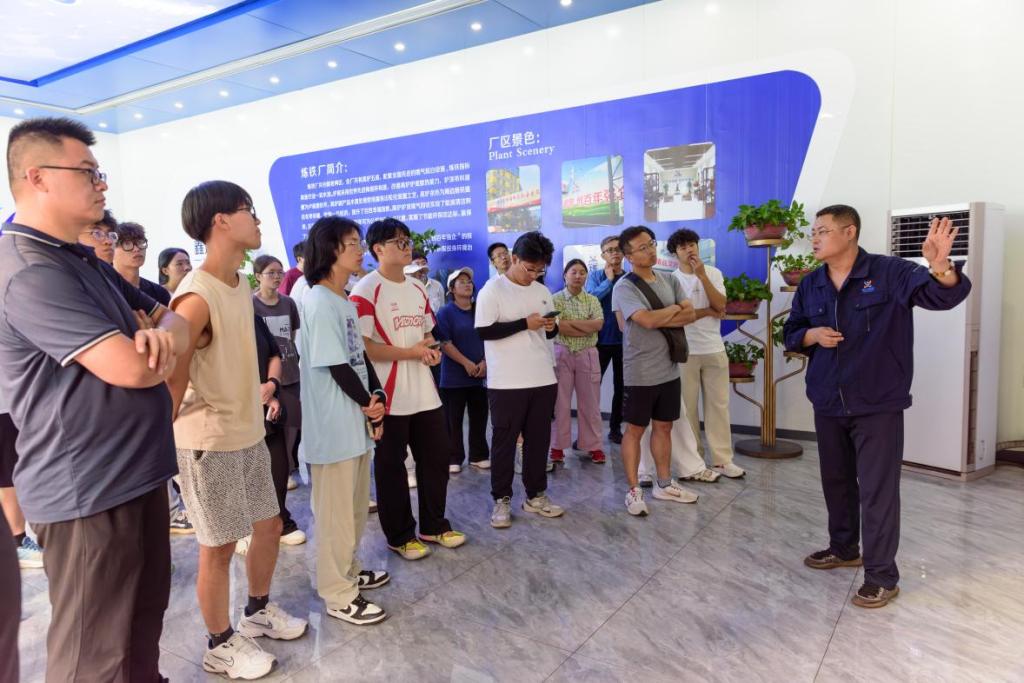 如果说文化展厅是“理论启蒙的课堂”,那么炼铁车间便是“视觉与认知的震撼现场”。当师生们走进炼铁厂,通红的铁水从出铁口喷涌而出,裹挟着灼热的温度与磅礴的力量,如一条奔腾的火龙划破车间,瞬间点燃了所有人的探索热情。讲解员结合现场场景,从铁矿石的筛选、高炉的冶炼原理,到余热回收系统、废气净化技术的应用,层层拆解现代化炼铁的全流程。讲解员的介绍让同学们眼前一亮,“节能减排技术在城市工业区规划中,如何与周边居住区的环境防护距离进行科学匹配?”这一问题引发了许多同学进行讨论,专业的互动让现场氛围愈发热烈,师生们在“观察—提问—思考”中,将工业生产的“绿色逻辑”与城乡规划的“生态目标”紧密串联。