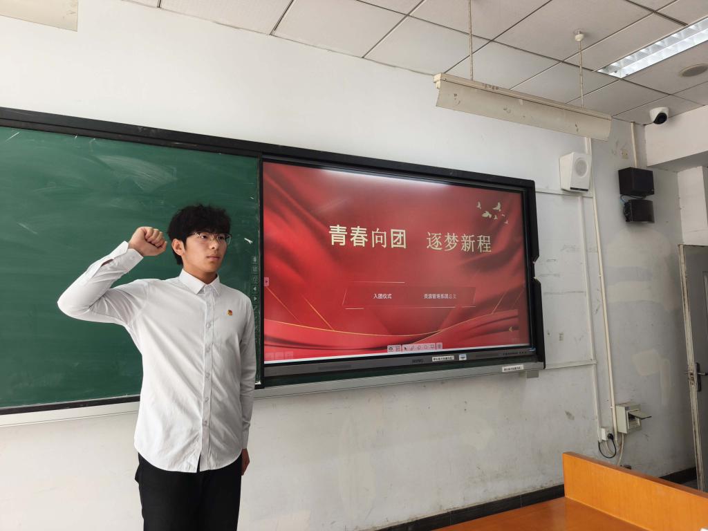 在领誓环节,李嘉祺同学站在队伍前方,声音铿锵有力。在他的带领下,新团员们高举右拳,以饱满的精神状态庄严宣誓。“我志愿加入中国共产主义青年团……”誓言声声入耳,字字铿锵,响彻整个会场,充分展现出青年学子们坚定的理想信念与矢志奋斗的决心。
